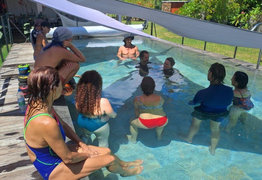 Aucune aptitude à la natation n’est requise. Il s’agit d’une expérience de présence mutuelle plutôt que de performance. L’accent est mis sur l’écoute, le soutien et le simple fait d’être ensemble dans l’eau.