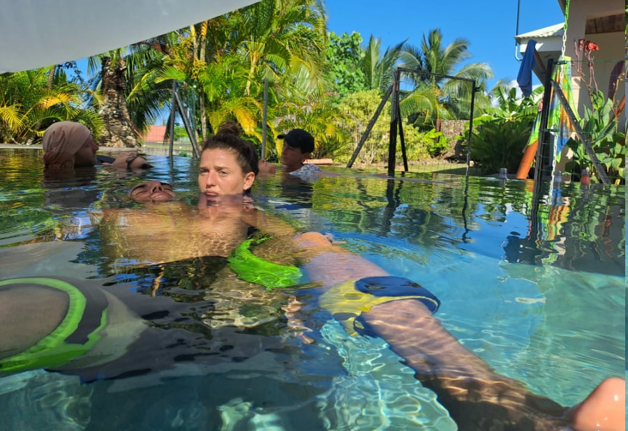 La séance se déroule dans une piscine chaude où une personne soutient doucement l’autre. Le receveur flotte sans effort, la tête et le corps étant maintenus dans le confort. Les mouvements sont lents et intuitifs, alternant entre immobilité et légèreté, toujours guidés par la respiration.